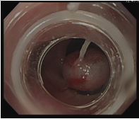 バルーンを膨らませ、食道静脈瘤に硬化剤を注入している際の内視鏡画像